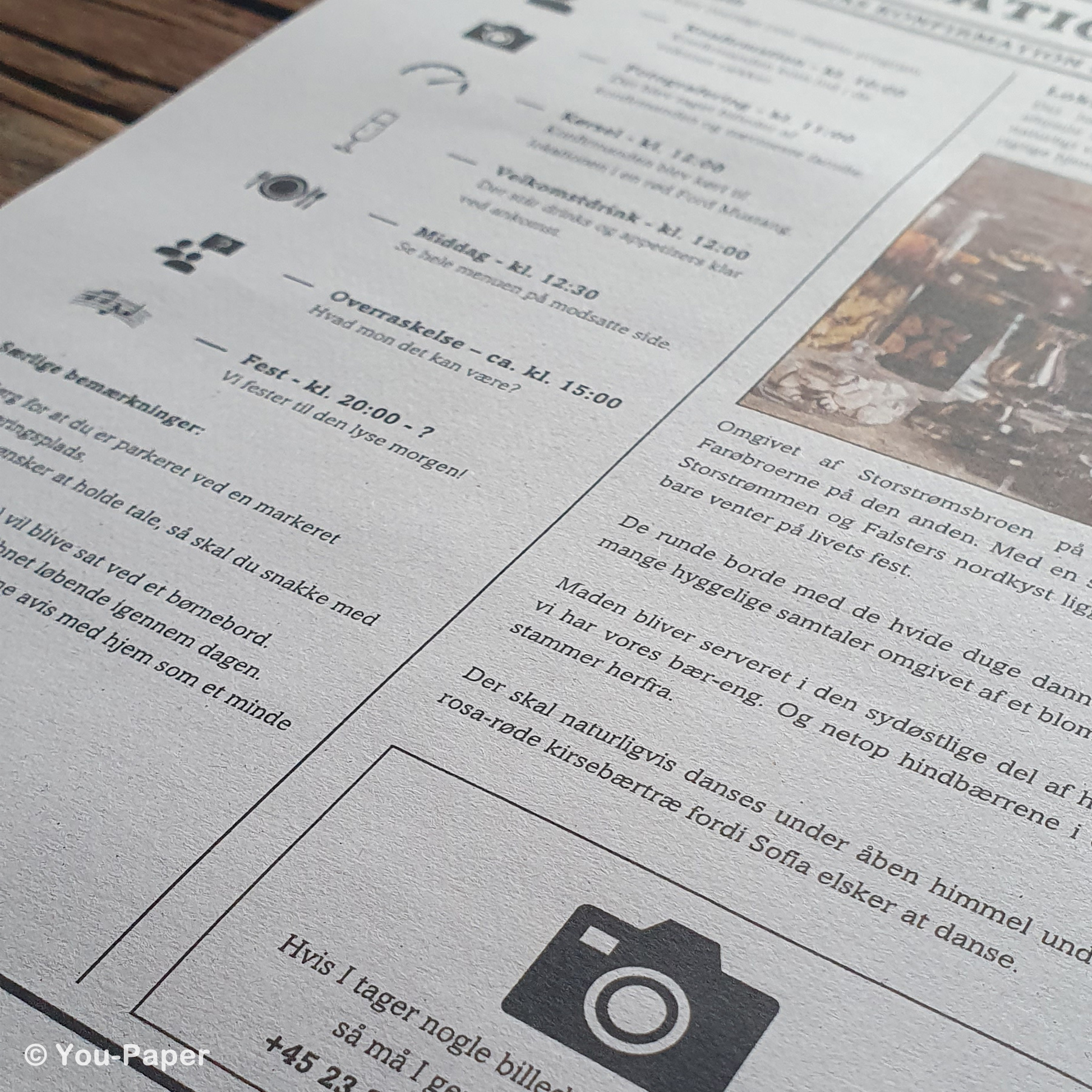 Flot trykte aviser på 8 sider, der leveres i stilren æske – klar til festen.
