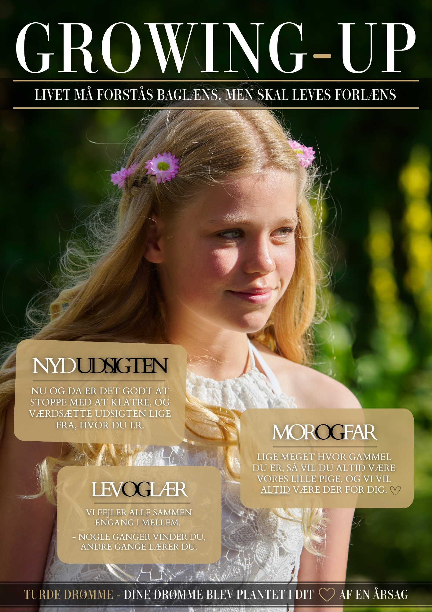 Den personlige konfirmations plakat vil være et unikt minde om den store dag og det kloge ord til konfirmanden vil give et boost af selvtillid og kærlighed, når man allermest har brug for det på sin vej gennem livet.
