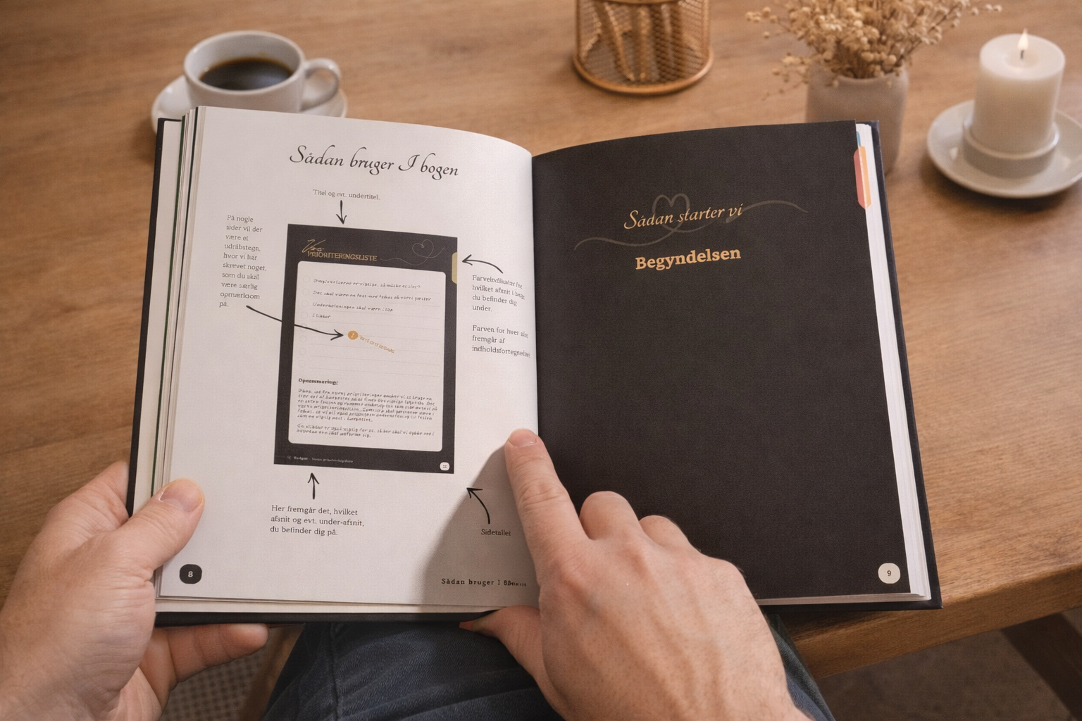 Vi har stor kærlighed til kvalitet. Bogen er derfor lavet som hardcover, og udarbejdet i et flot stilrent design i rolige og afdæmpede farver, der passer til begge køn. Forsiden er desuden udsmykket med tekst i 3D guldfolie.