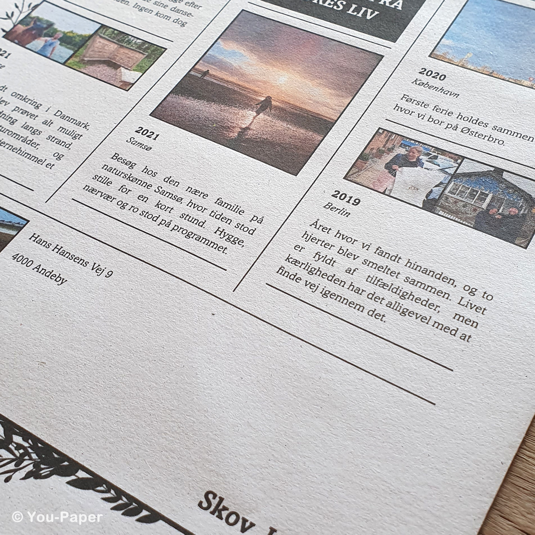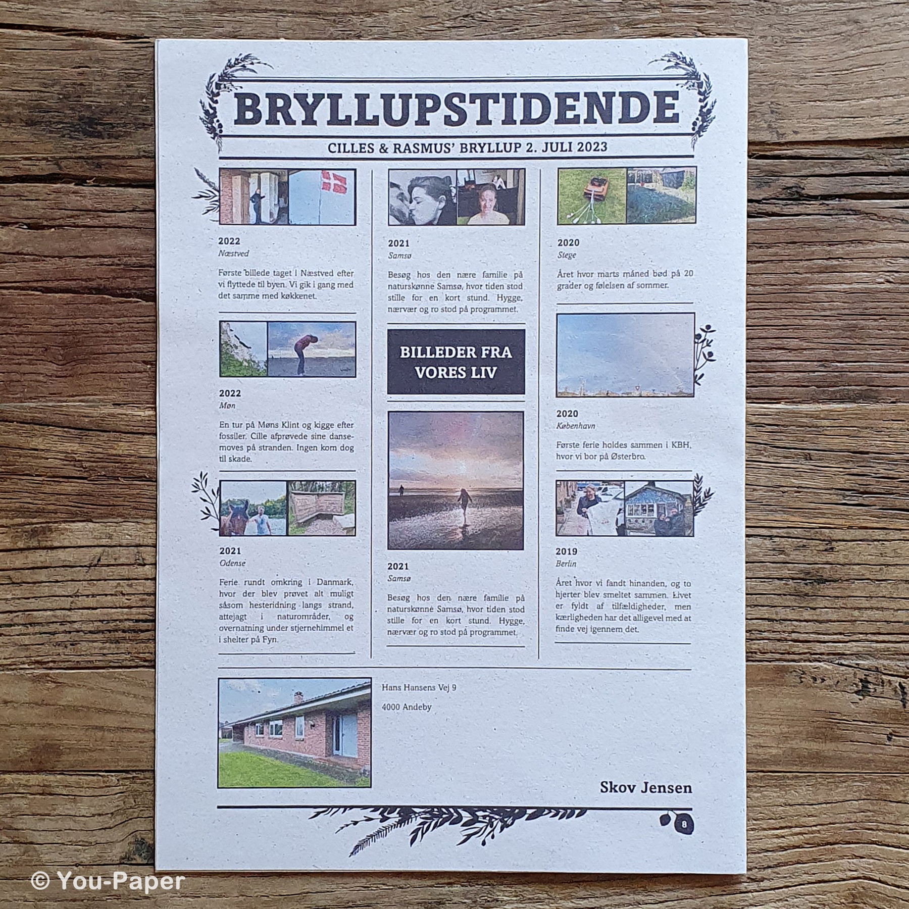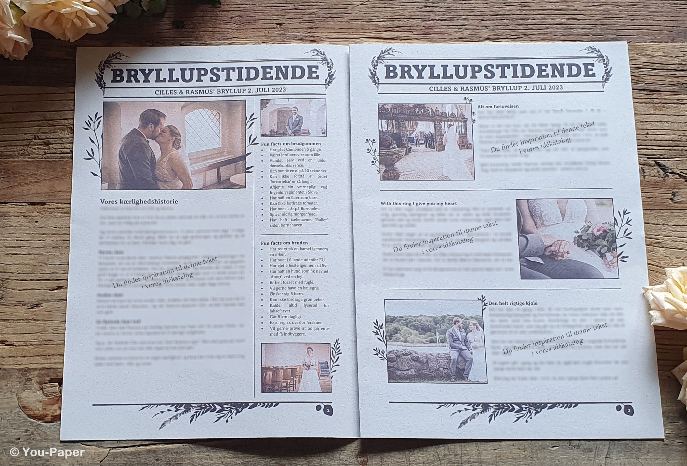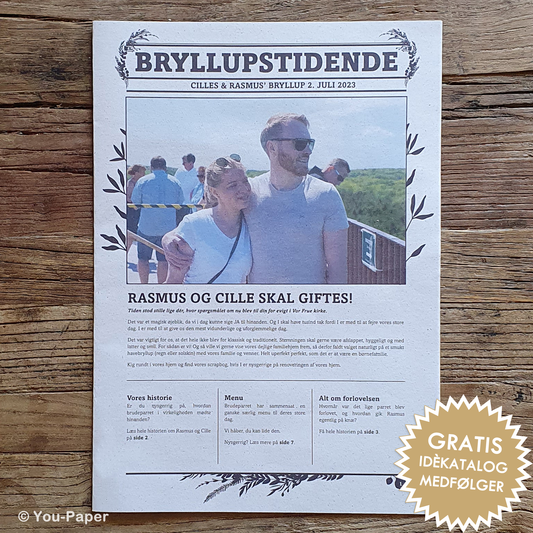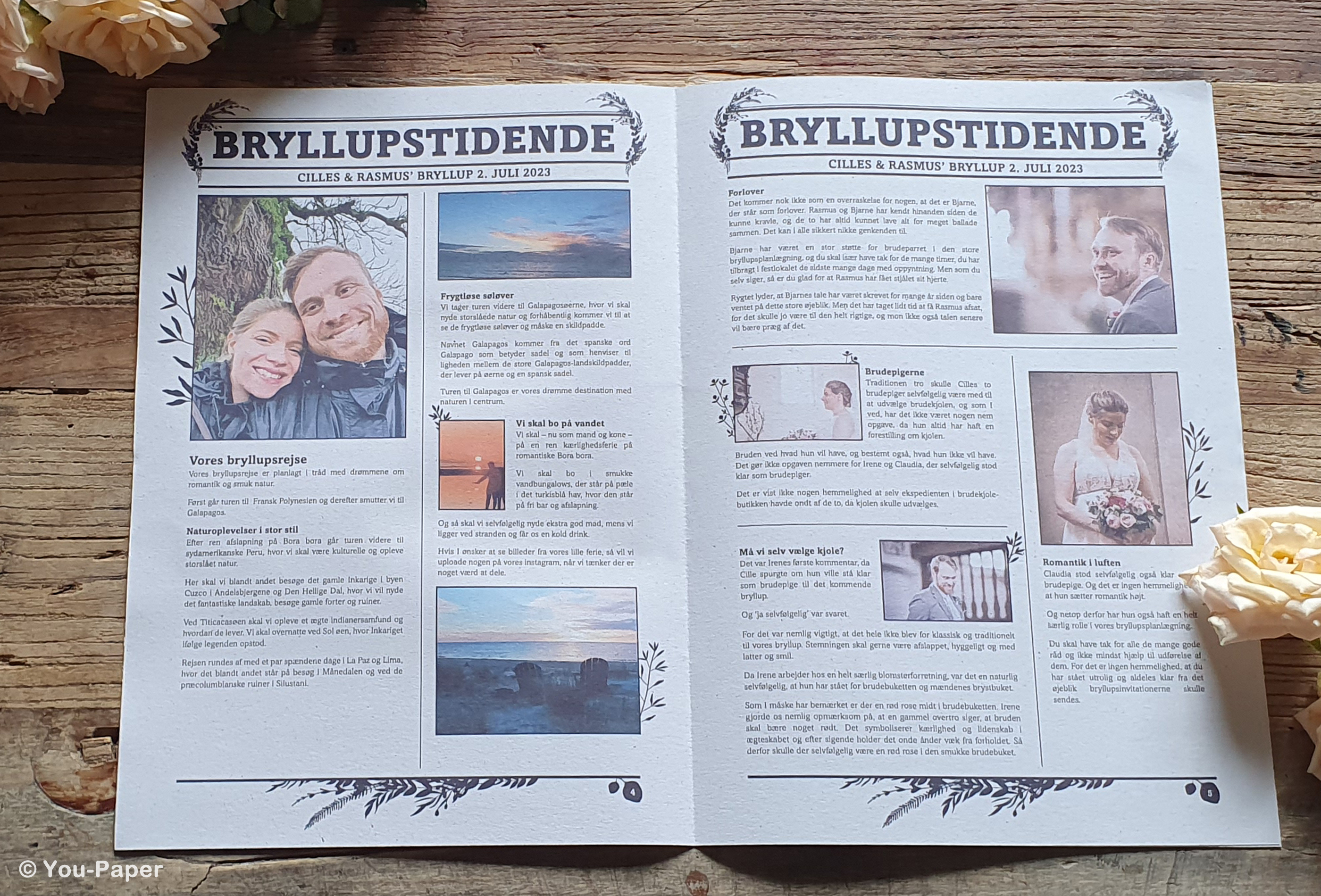Flot trykte aviser på 8 sider, der leveres i stilren æske – klar til festen.