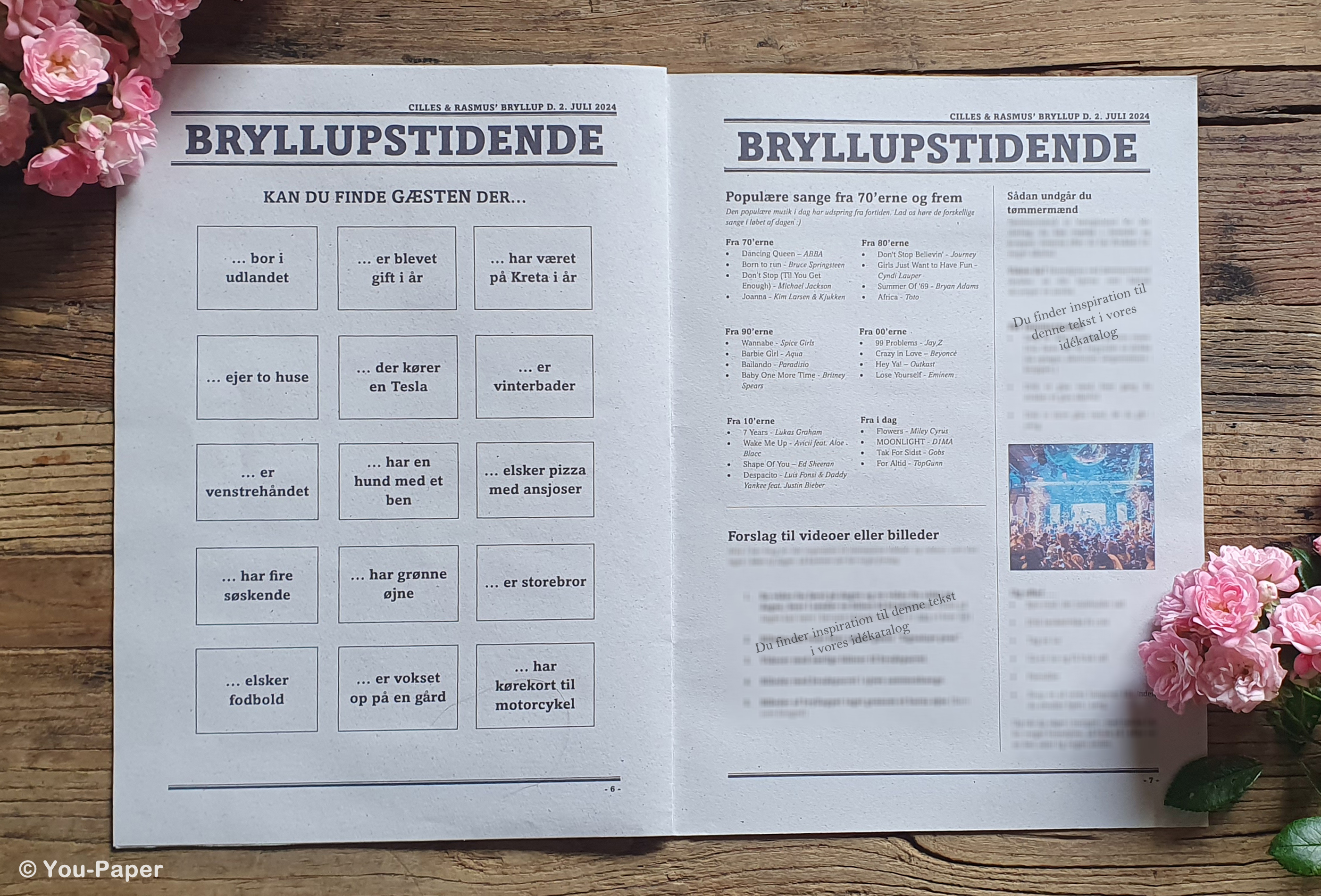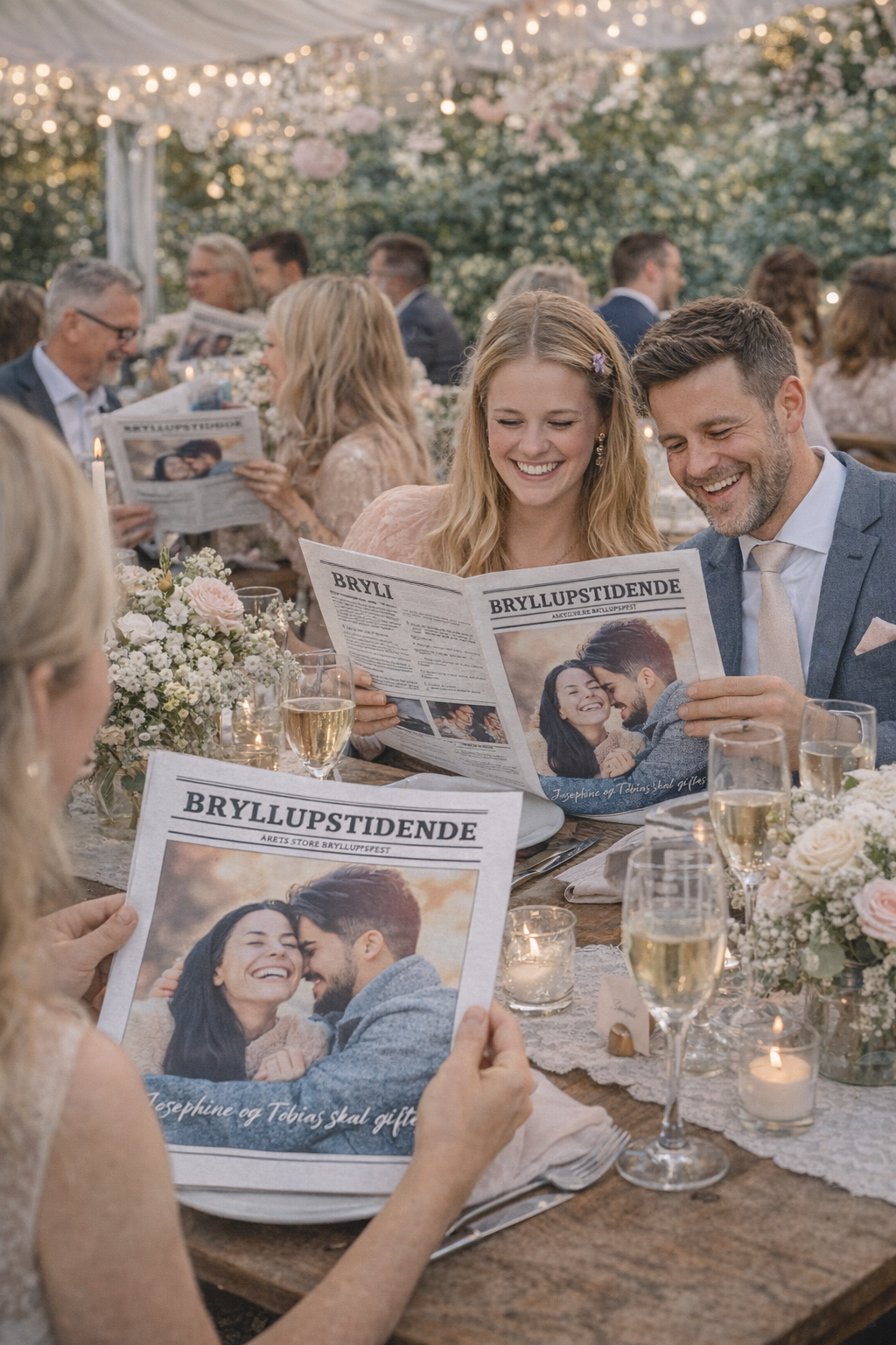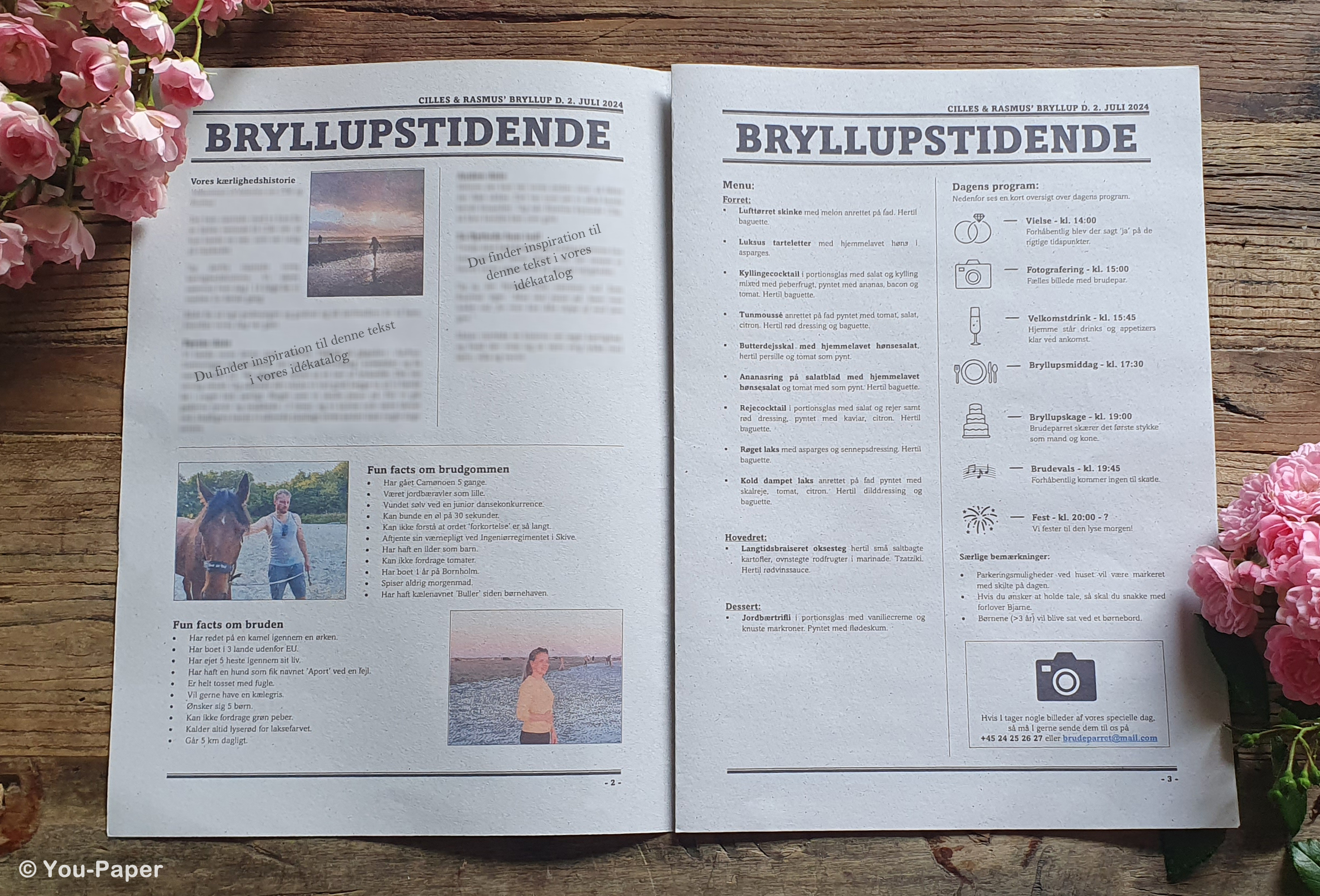 Flot trykte aviser på 8 sider, der leveres i stilren æske – klar til festen.