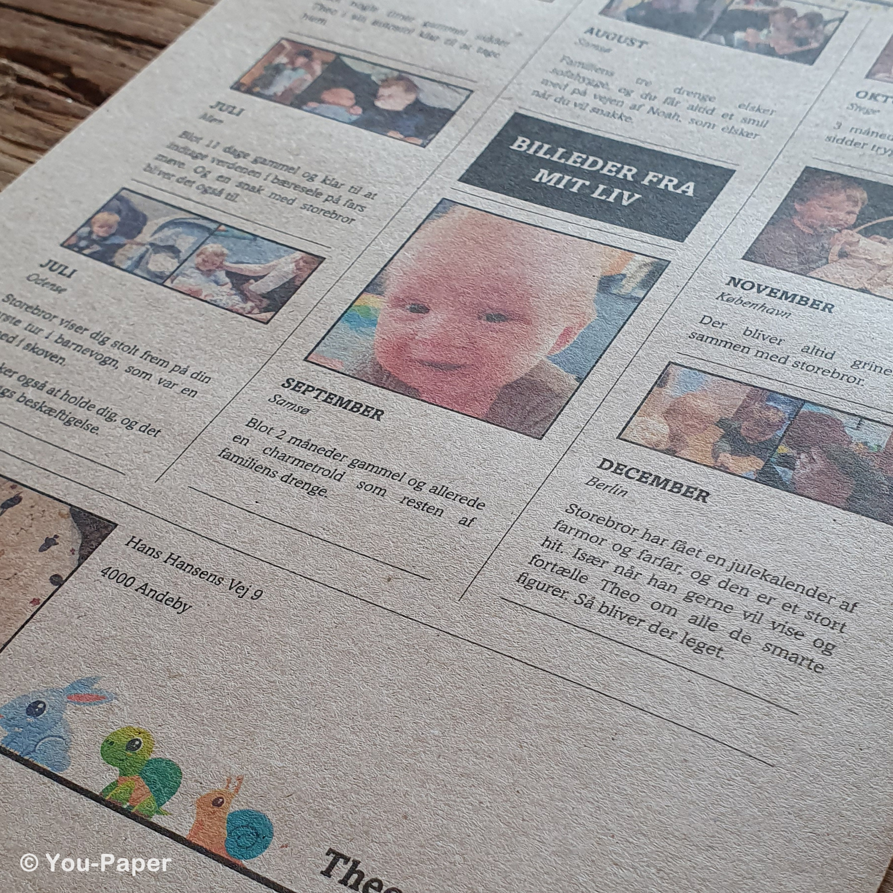 Mange forældre elsker især at skrive om guldklumpens navn og dets betydning, stjernetegn og kloge ord fra mor og fra. Særligt bagsiden af avisen er lidt sjov og speciel. Den er nemlig opsat som den traditionelle bagside fra ejendomsmæglere – men i stedet for, at gæsterne kan se, hvilke huse, der er til salg, har I mulighed for at sætte billeder og tekst ind fra jeres barns første uger og måneder, som er en virkelig sød måde at se jeres babys udvikling på.